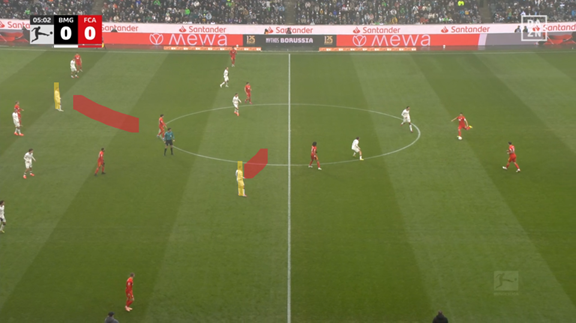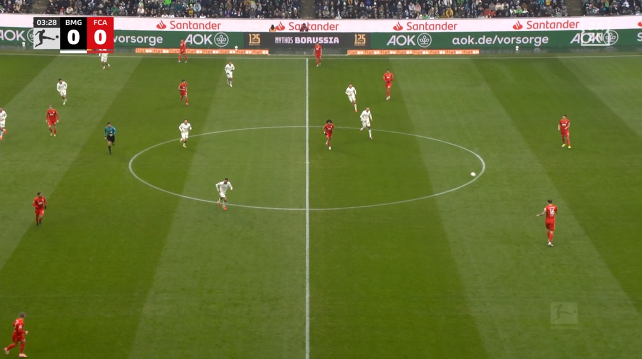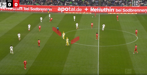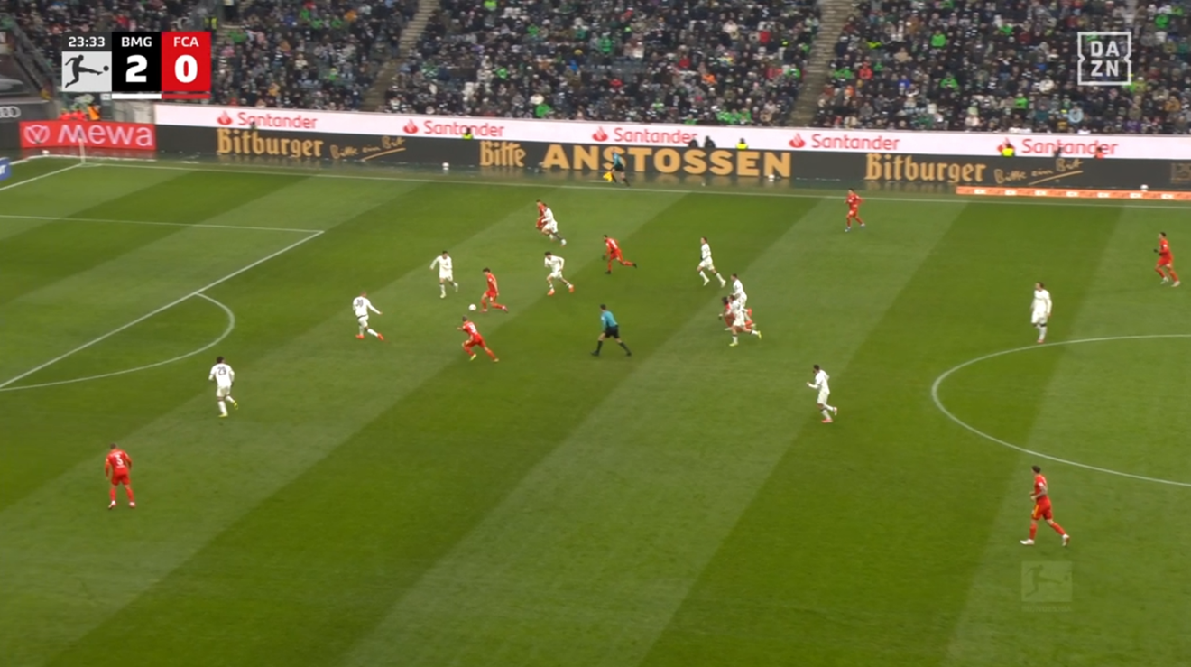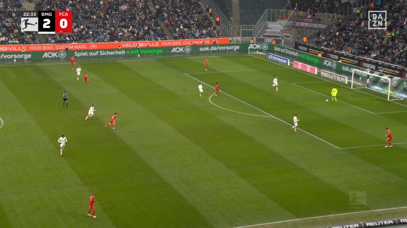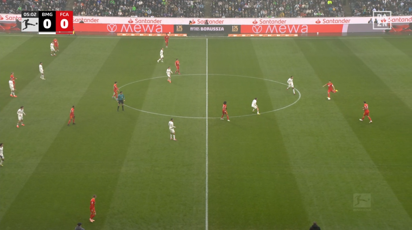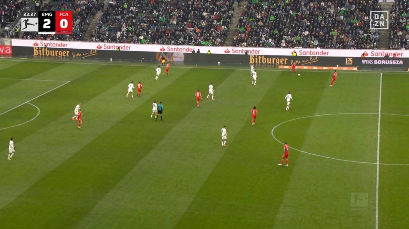 Die gute Gladbacher Positionierung im hohen Pressing erhöhte den Druck auf den Augsburger Schlussmann spürbar. Die Fohlen hatten ein gutes Gespür in der Balance zwischen Druck auf den Mann vor ihnen und der Sicherung des Raums hinter ihnen. So musste Dahmen den Ball in umkämpfte Zonen schlagen und konnte selten mit flachen Pässen in die zentrale agieren.
