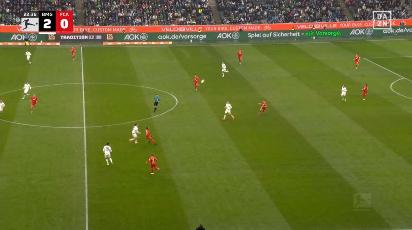 Bei grober Betrachtung wird bereits klar: Luca Netz befindet sich durch sein Aufrücken in der falschen Kette, womit Borussia in der letzten Linie nur noch in Gleichzahl mit den aufgerückten Augsburgern steht. Zwar wird er von Neuhaus sofort zurückgewiesen, doch Augsburg erkennt den Vorteil zu schnell und bespielt den Raum vor und zwischen den drei Innenverteidigern.