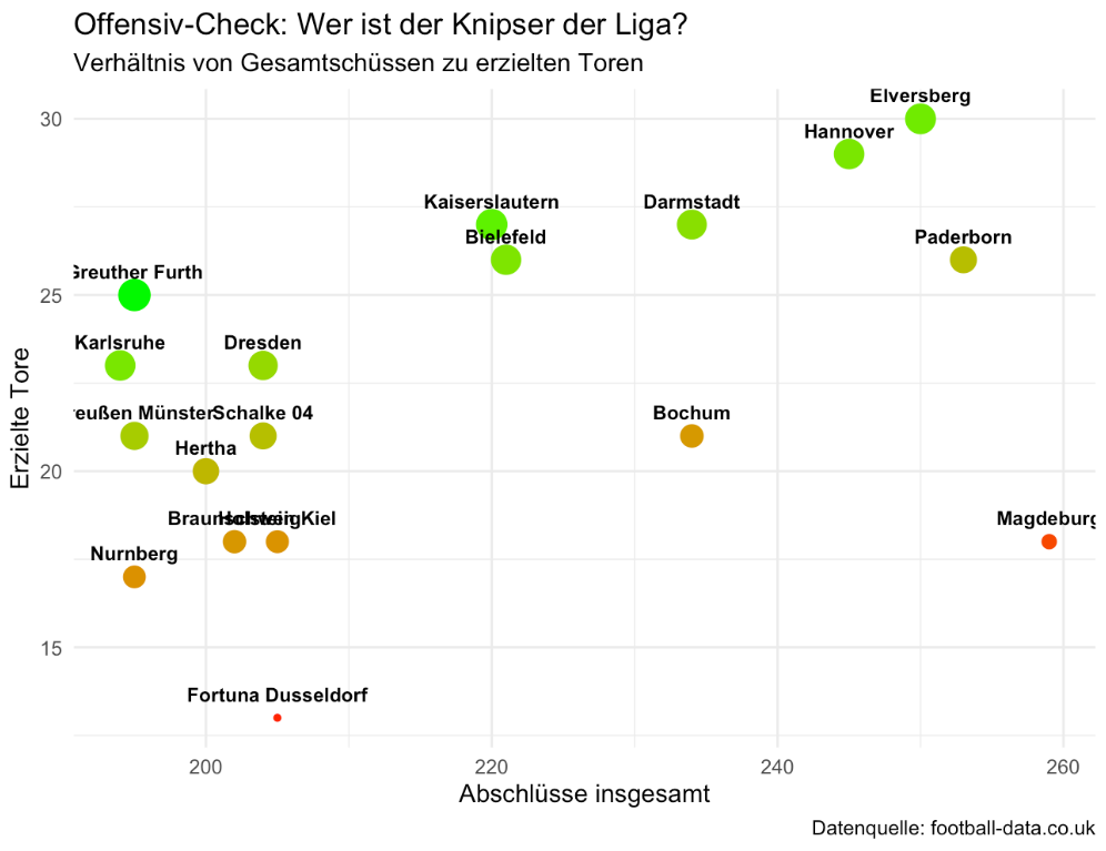 Am rechten unteren Rand der Grafik finden wir die Sorgenkinder der Hinrunde. Der 1. FC Magdeburg führt die Liga mit 258 Torschüssen zwar statistisch an, die Ausbeute von nur 18 Toren ist jedoch alarmierend. Mit einer Chancenverwertung von lediglich ca. 5 % ist der FCM das ineffizienteste Team der Liga. Ähnlich dramatisch stellt sich die Situation bei Fortuna Düsseldorf dar. Trotz einer spielerisch dominanten Anlage und vielen Abschlüssen steht die Fortuna bei der schwächsten Chancenverwertung der Liga (ca. 7 %). Die Grafik verdeutlicht hier das zentrale Problem beider Klubs: Der enorme Aufwand steht in keinem gesunden Verhältnis zum Ertrag.