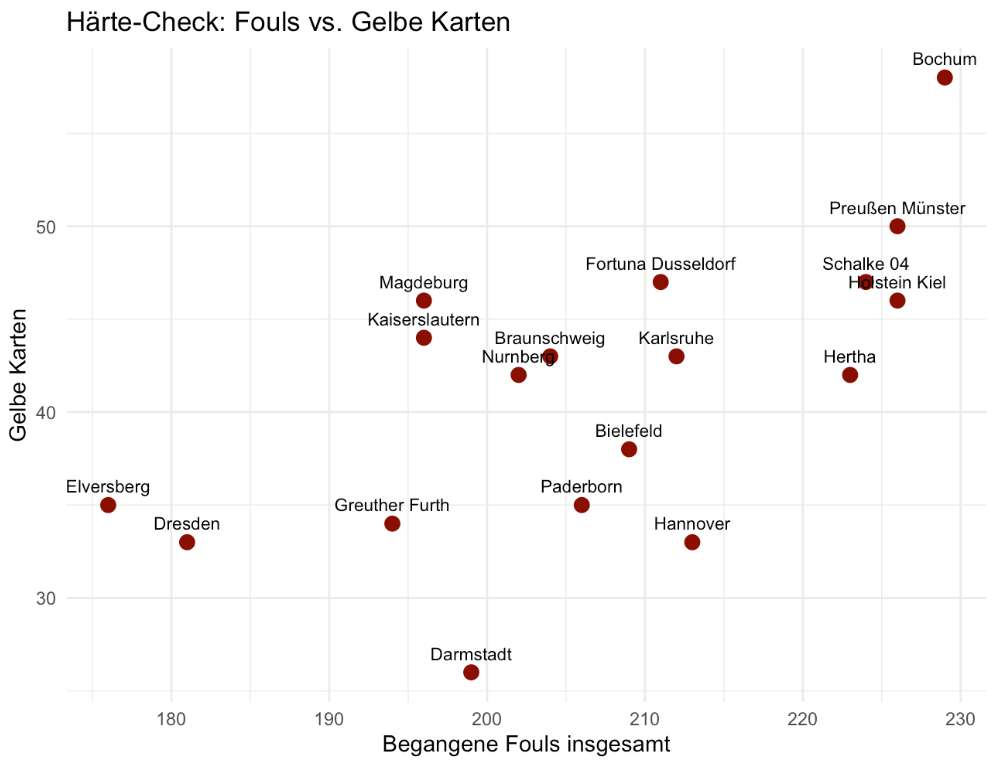 Der VfL Bochum und Preußen Münster markieren die obere rechte Ecke der Grafik. Mit fast 230 begangenen Fouls und einer enorm hohen Anzahl an Gelben Karten (über 50 bei Bochum) agieren diese Teams am physischen Limit. Hier korreliert eine hohe Foulquote direkt mit disziplinarischen Konsequenzen.