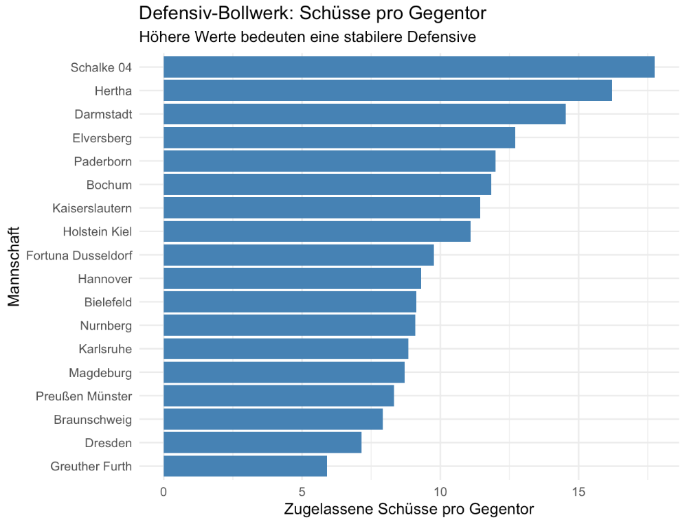 Spannend ist die Position der SV Elversberg. Obwohl sie in unserer ersten Grafik als „Spektakel-Team“ auffielen, belegen sie auch im Defensiv-Ranking einen Spitzenplatz (ca. 13 Schüsse pro Gegentor). Die Saarländer schaffen den schwierigen Spagat zwischen mutigem Angriffsfußball und einer kontrollierten Restverteidigung, was sie zum aktuell gefährlichsten Allrounder der Liga macht.